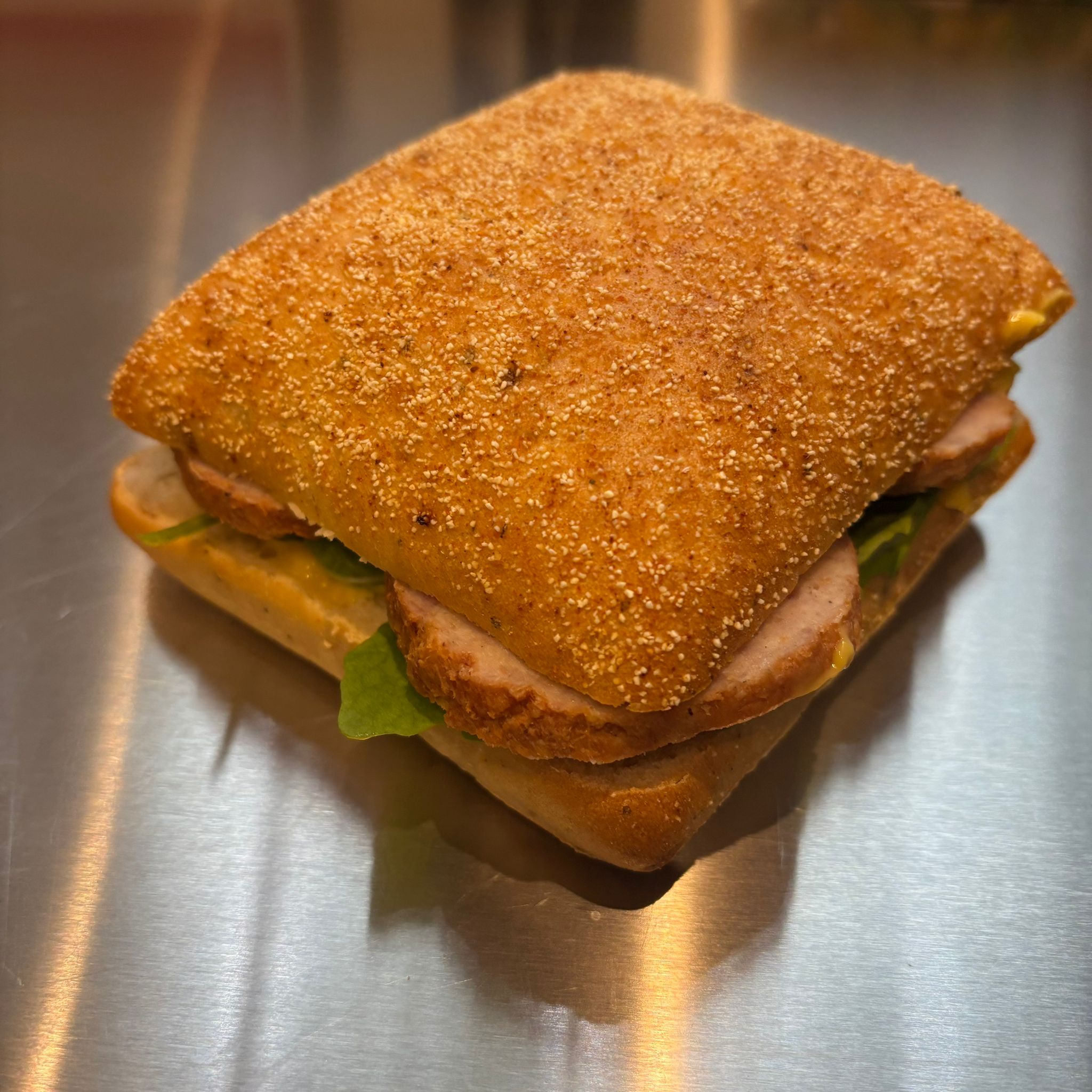 Een chilli broodje met boulet, rode ui, bicky uitjes, rucola en homemade saus.