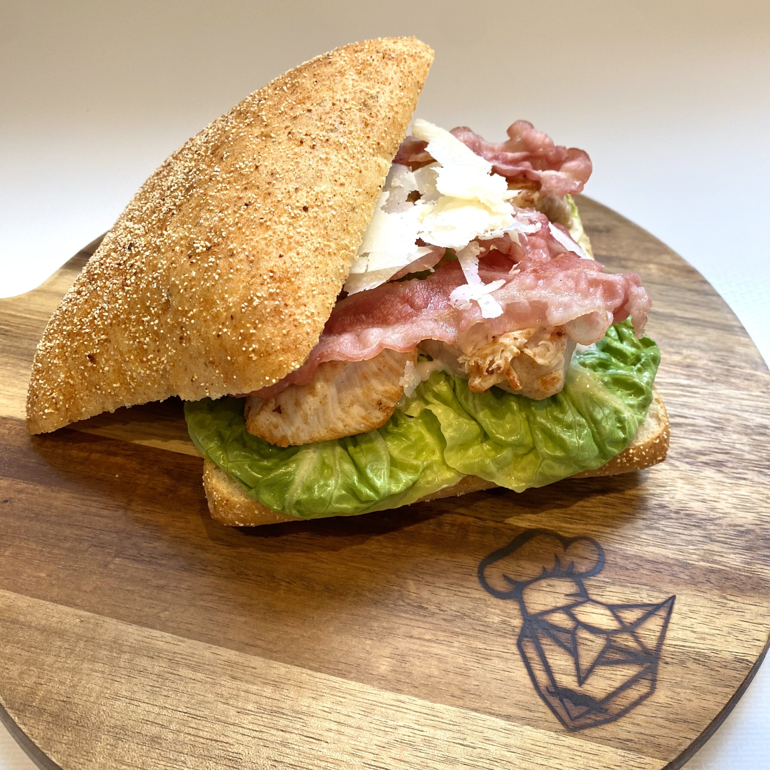 Heerlijk chili broodje met gebakken kip, spek, Romeinse salade, Parmezaanse kaas en een ceasar dressing.