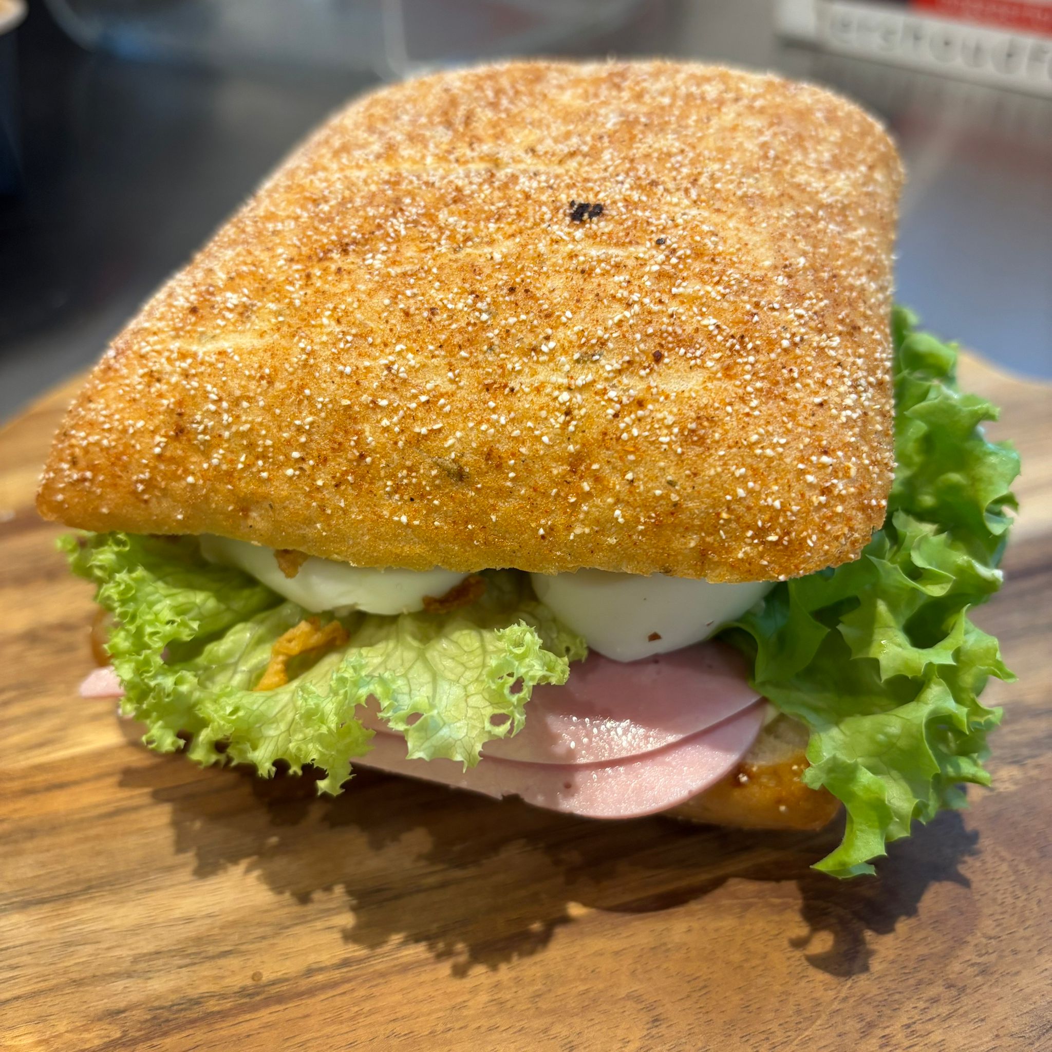 Een chilli broodje met hesp, kaas, mayo, sla, ui, ei en zout.