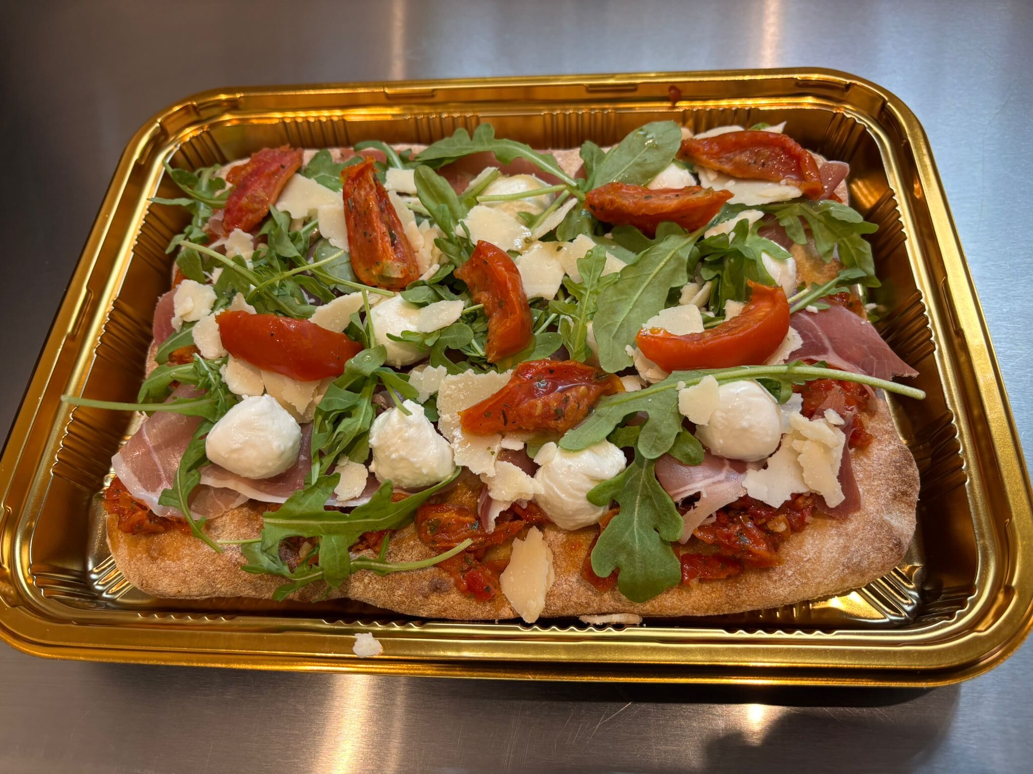 Pinsa belegd met Serrano ham, zongedroogde tomaatjes, groene pesto, pijnboompitjes, mozzarella, rucola en Parmezaanse kaas.