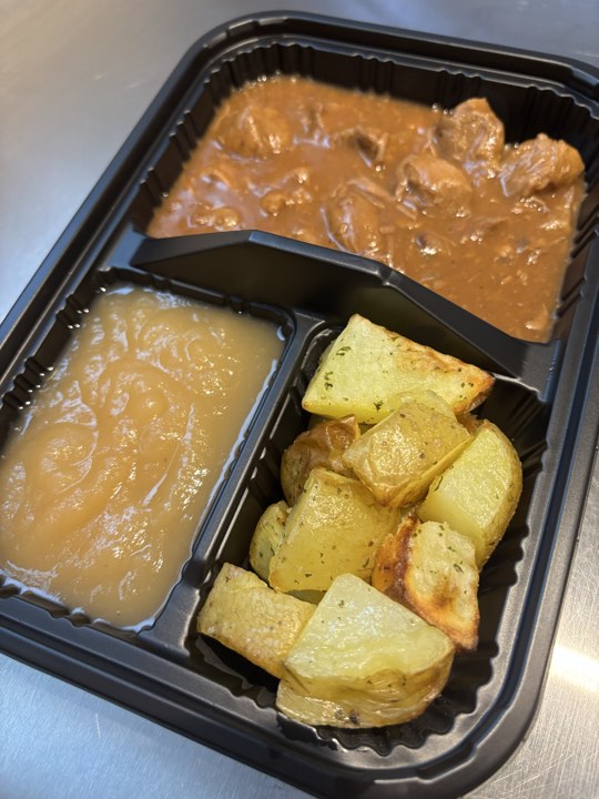 Ovengebakken patatjes, homemade rundsstoofvlees en appelmoes.