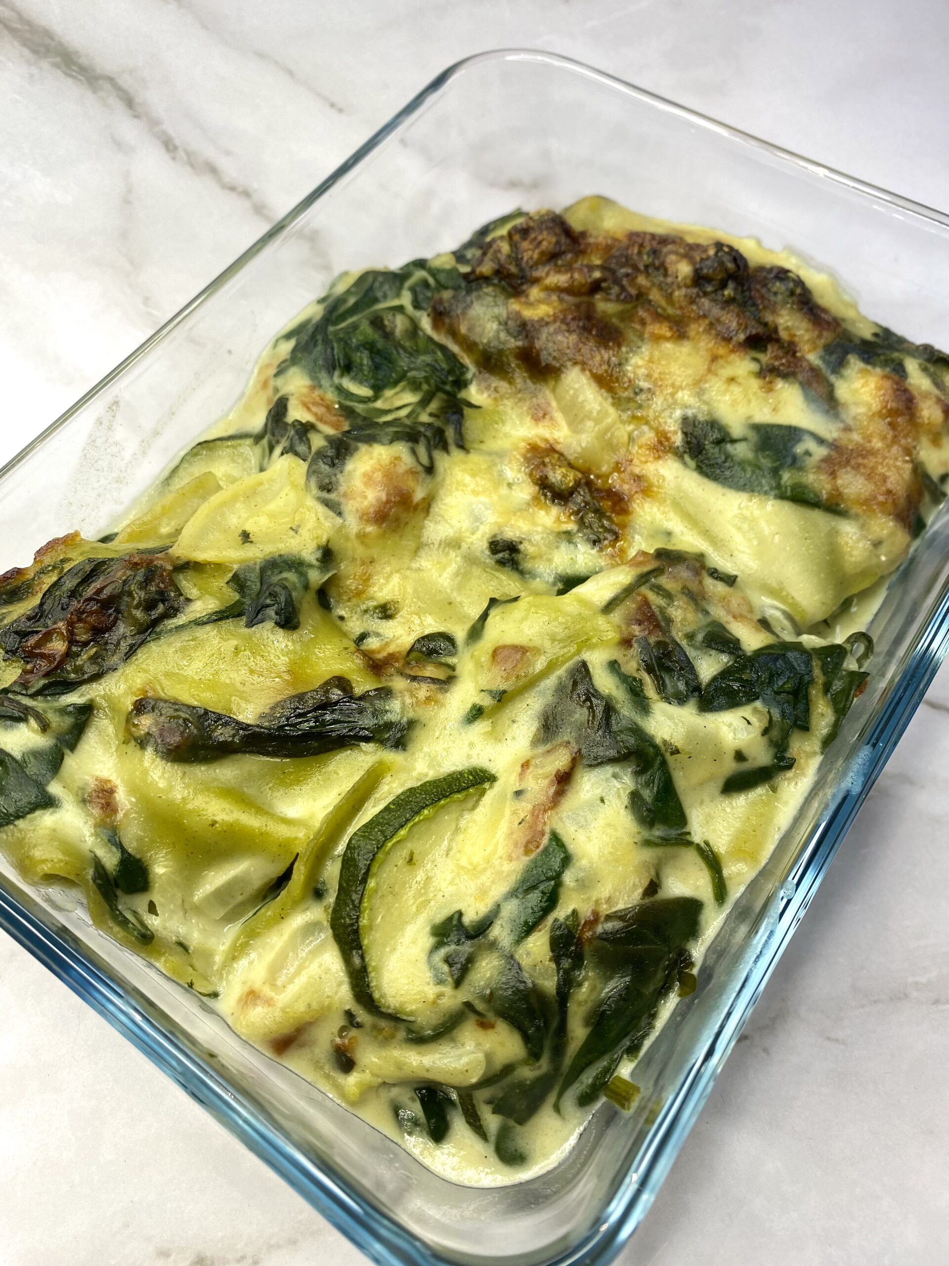 Heerlijke huisgemaakte groene (veggie) lasagna met courgette en spinazie in een roomsausje voor 3 a 4 personen. Moet nog afgebakken worden.